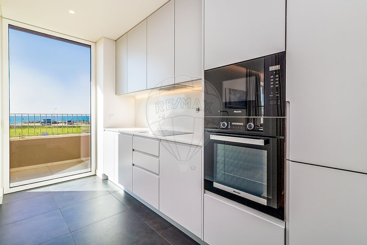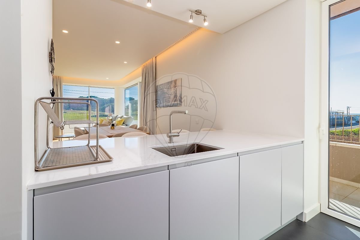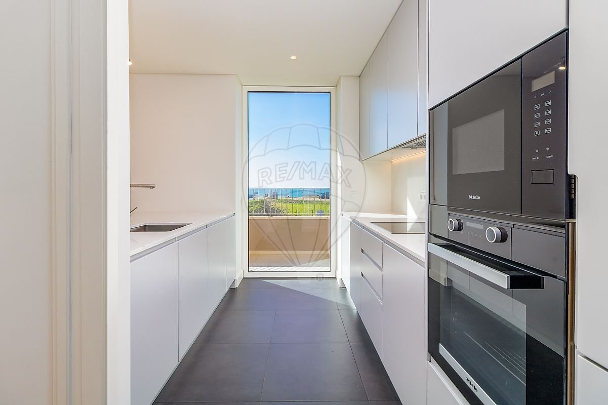 O interior revela uma espaçosa sala com vista direta para o mar, inundada de luz natural, que se prolonga harmoniosamente até à varanda. A cozinha encontra-se totalmente equipada, combinando funcionalidade e design moderno, ideal para quem aprecia praticabilidade e sofisticação no dia a dia.