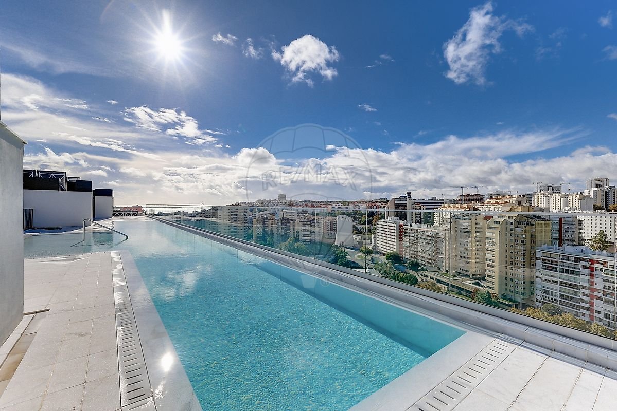 A piscina, elevada sobre a cidade, proporciona um ambiente absolutamente