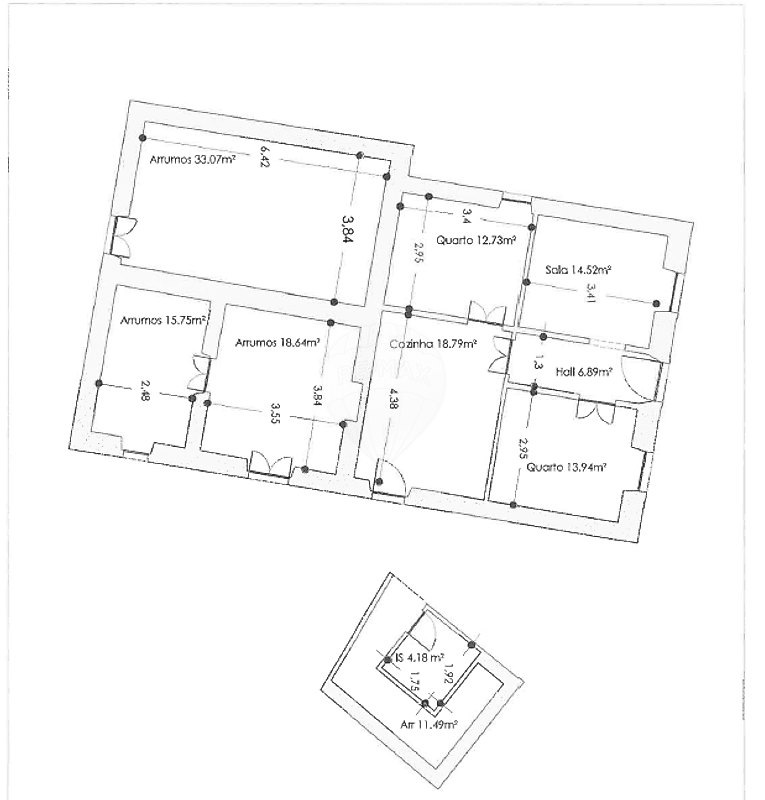 Moradia térrea, distribuída por hall de entrada, sala, dois quartos, cozinha, casa de banho e mais três compartimentos designados como arrumos