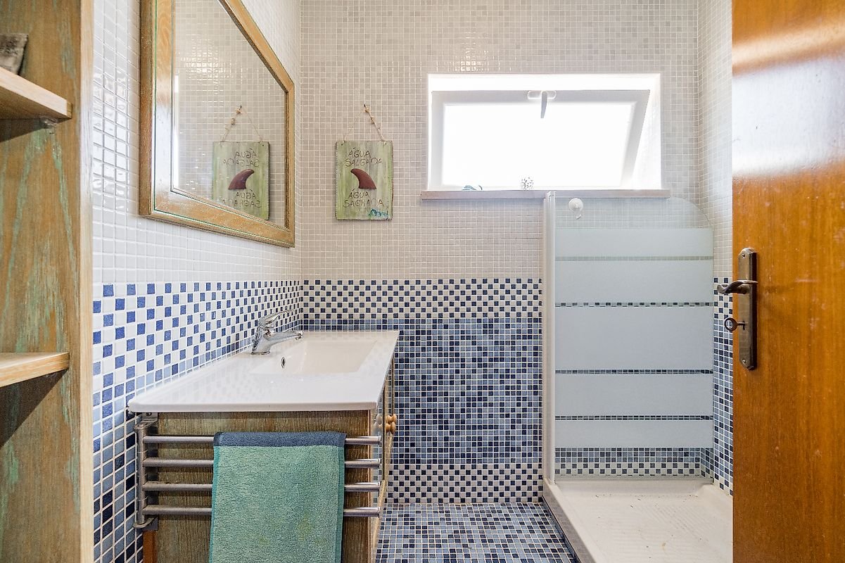 Entramos pelo hall que dá acesso a uma casa de banho com base de duche, uma sala espaçosa de 27m2, com lareira, muita luz natural e vistas incríveis para o mar e para a península de Peniche e uma grande cozinha totalmente equipada. A cozinha dispõe ainda de uma dispensa, casa das máquinas, e acesso direto ao exterior.