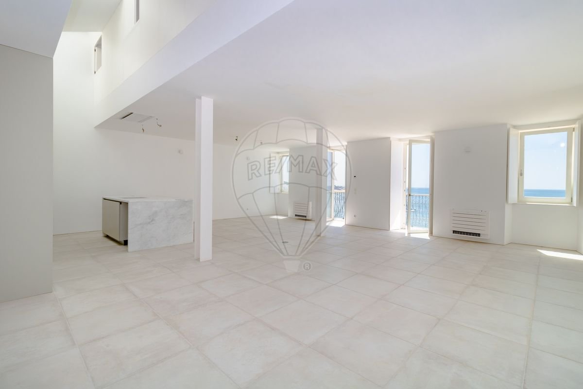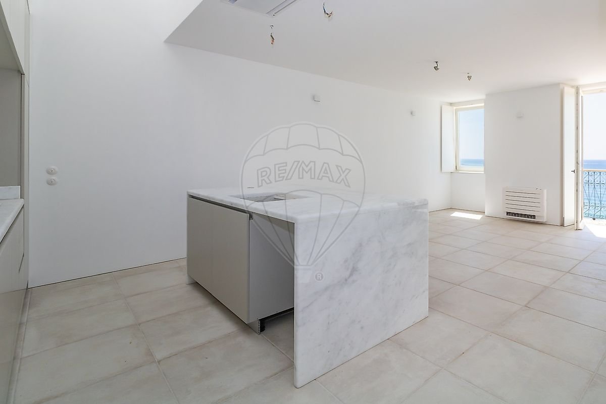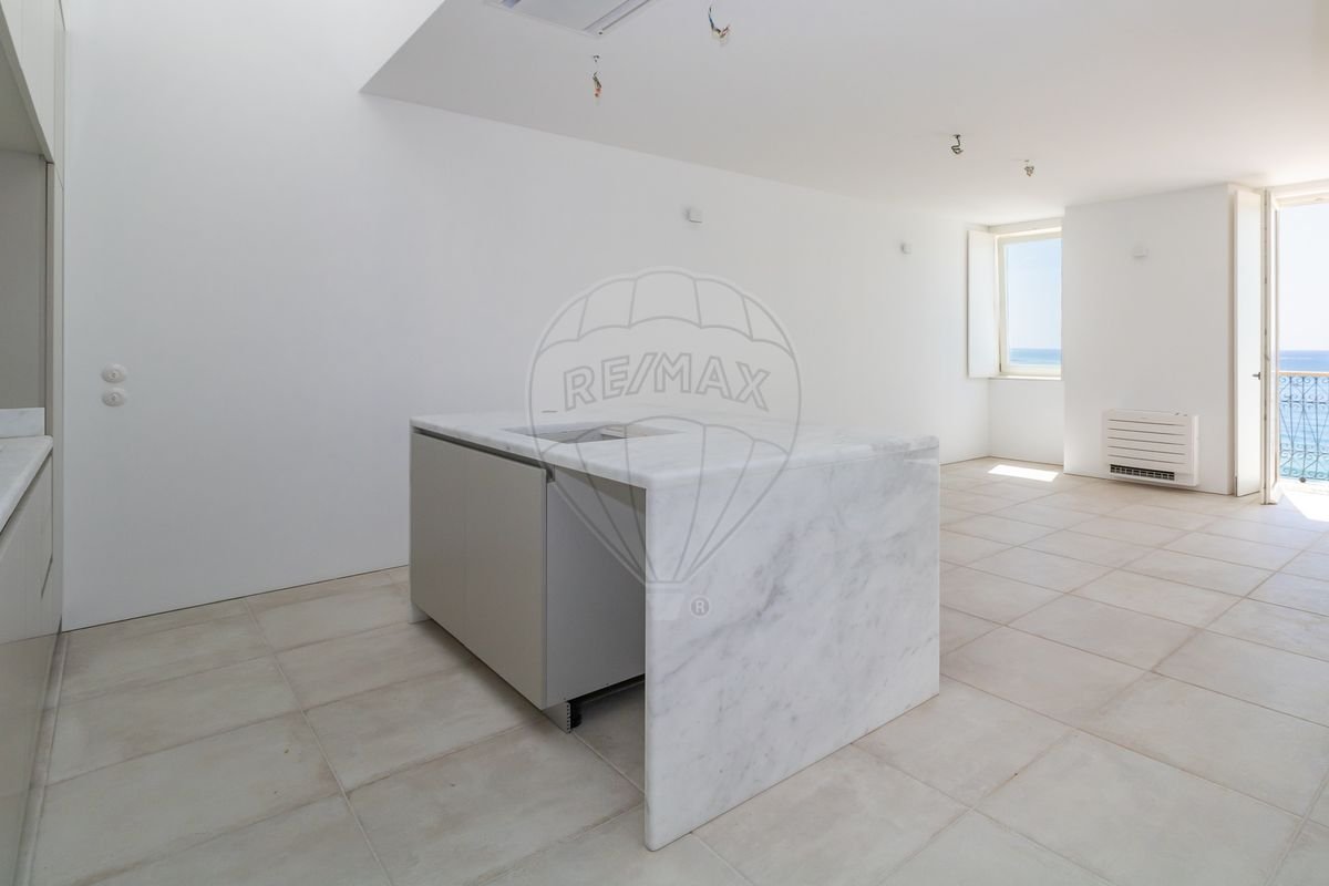 Sala de estar com janelas amplas voltadas para o mar com vistas deslumbrantes para o oceano, integrando-se harmoniosamente com a cozinha moderna e totalmente equipada, criando um ambiente perfeito para momentos de convívio e descontração.