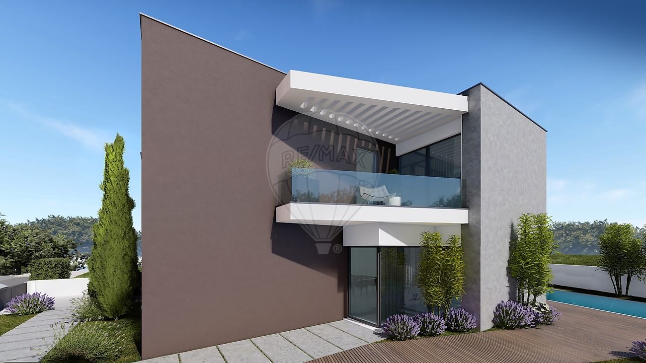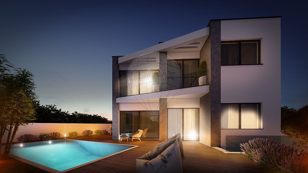 Moradia de traços contemporâneos, com área bruta de construção de 384 m2, com piscina, sita na Atalaia, a poucos minutos das praias de Porto de Barcas e Peralta.