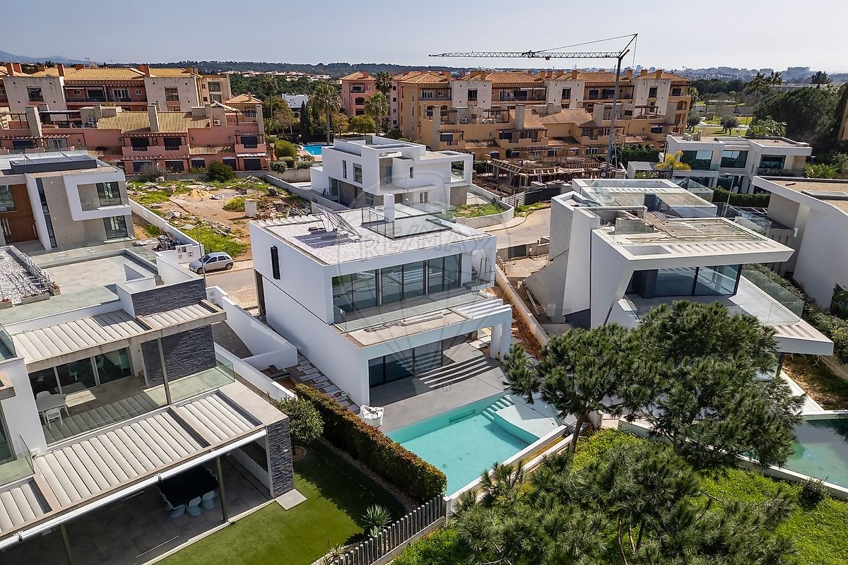 The first floor houses the three en-suite bedrooms, all with a balcony overlooking the pool. On this level, you will find access to the top floor, which has a large terrace with panoramic views view of the Golf