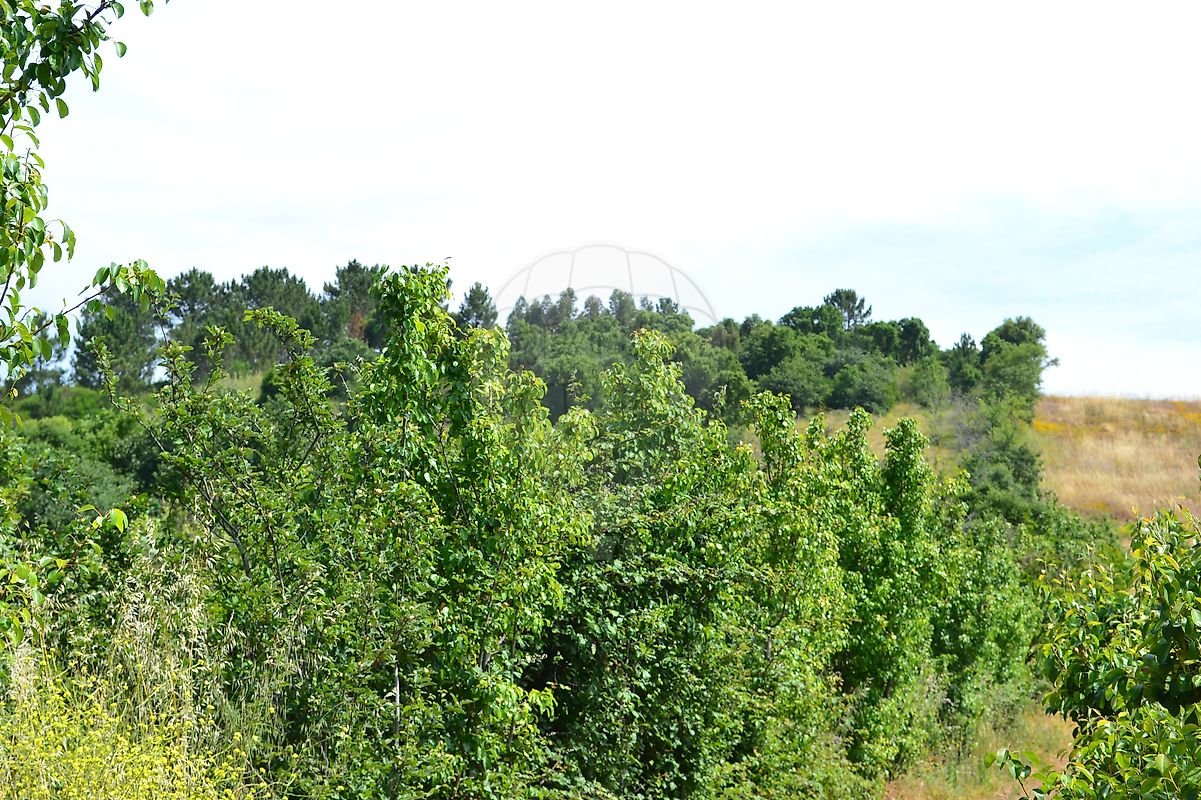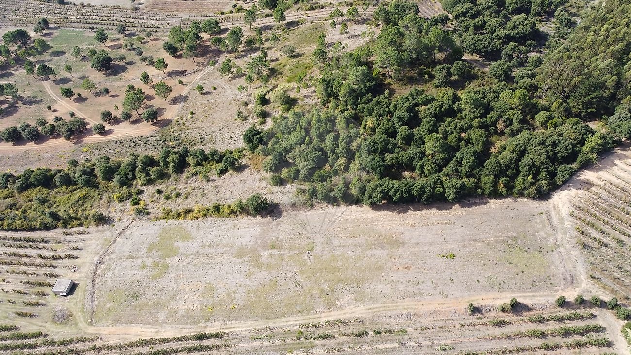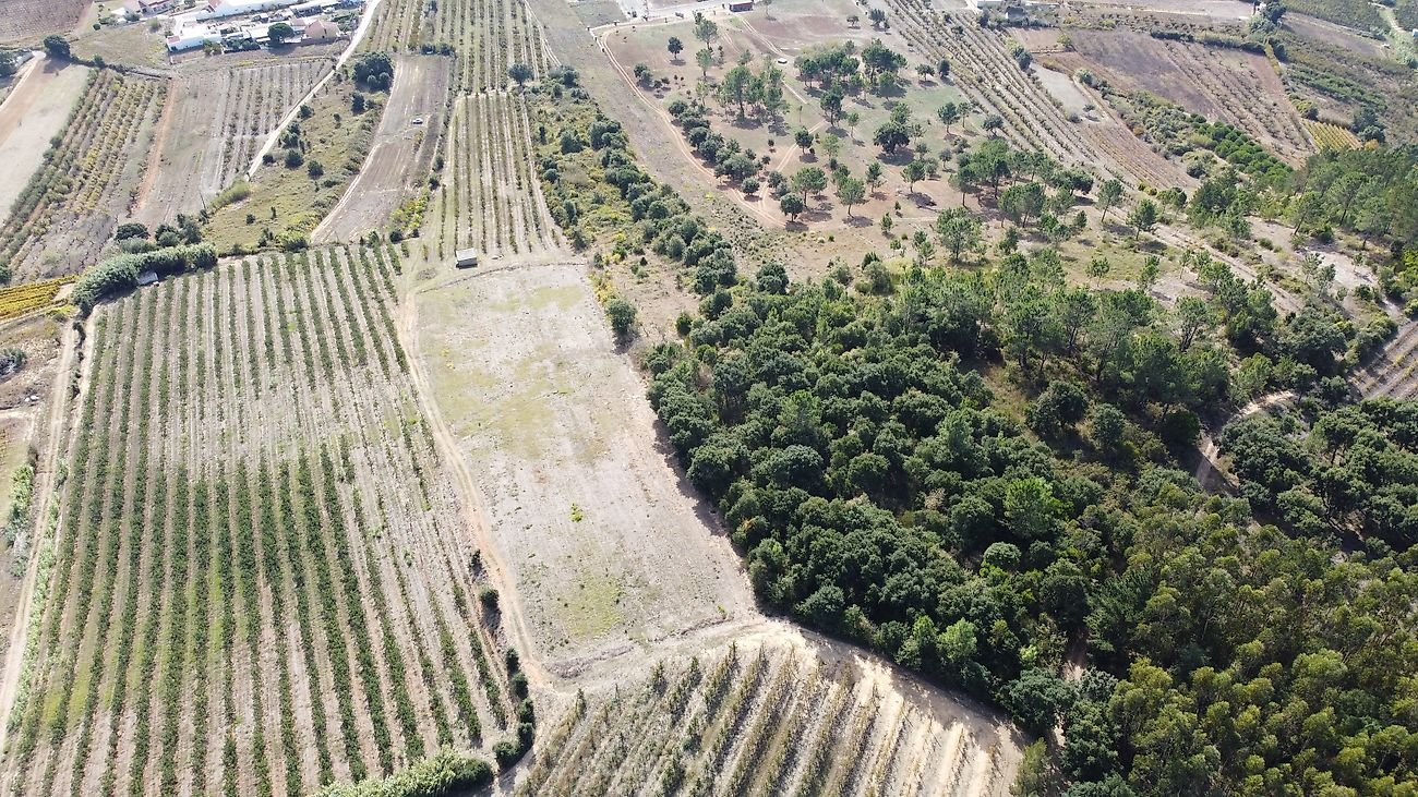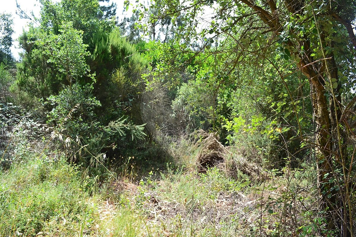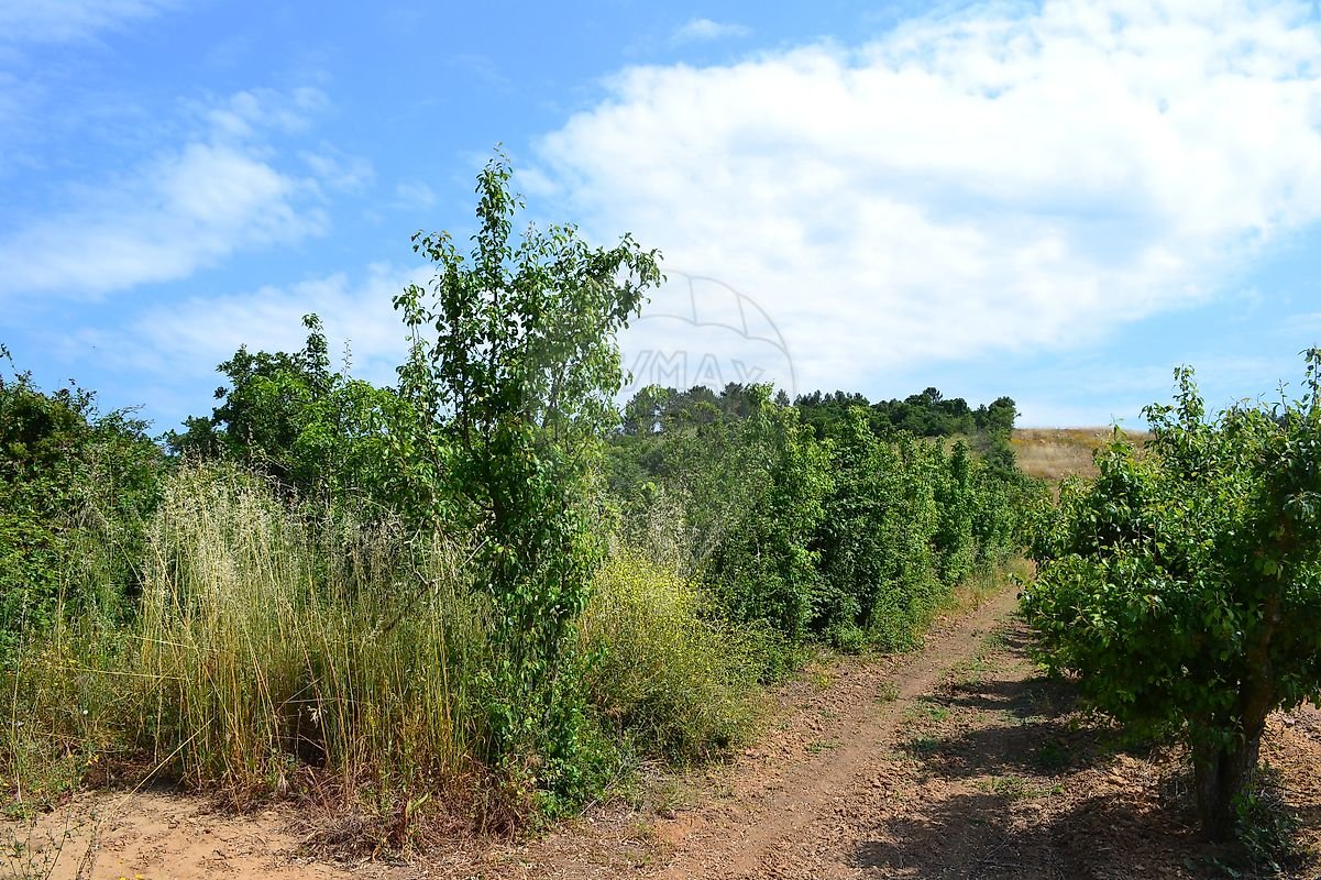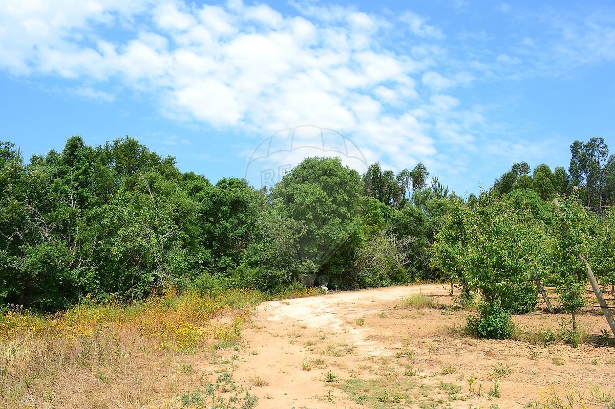 Cerca de metade do terreno em ligeiro declive, com várias árvores de fruto, a outra metade em declive mais acentuado com zona de mato e árvores de médio/grande porte.