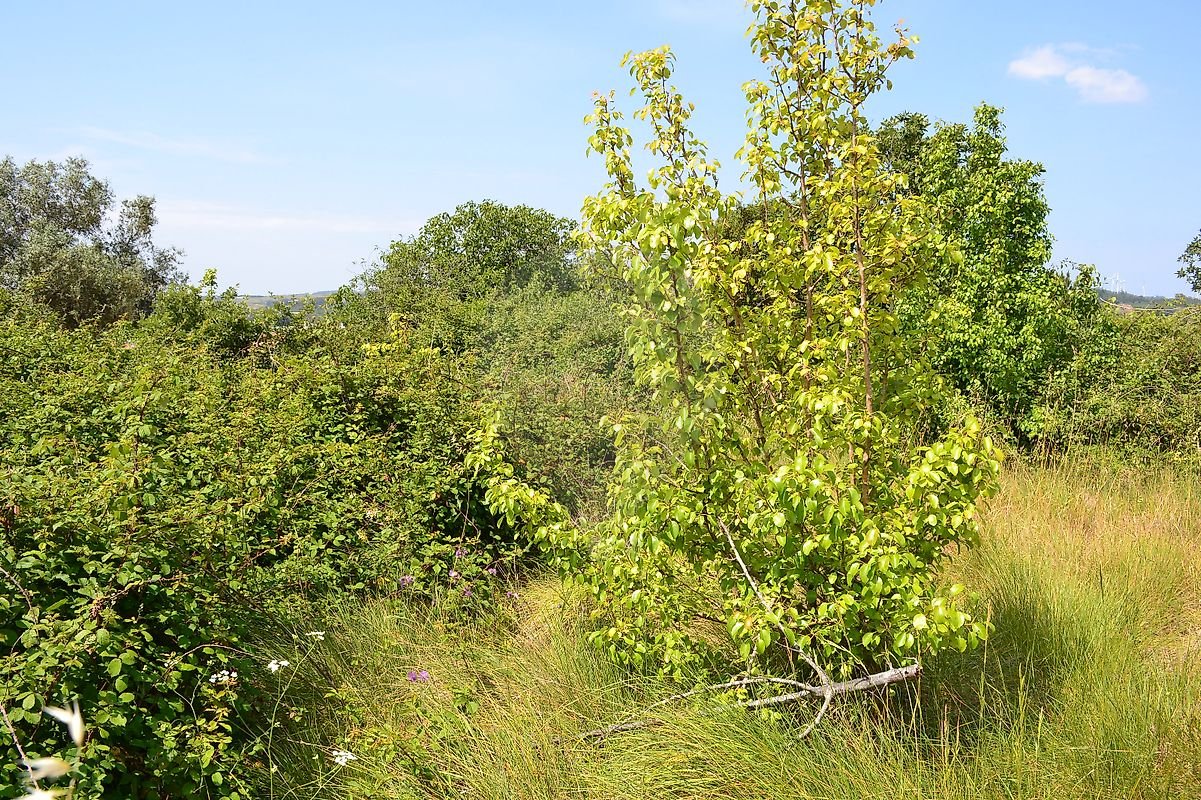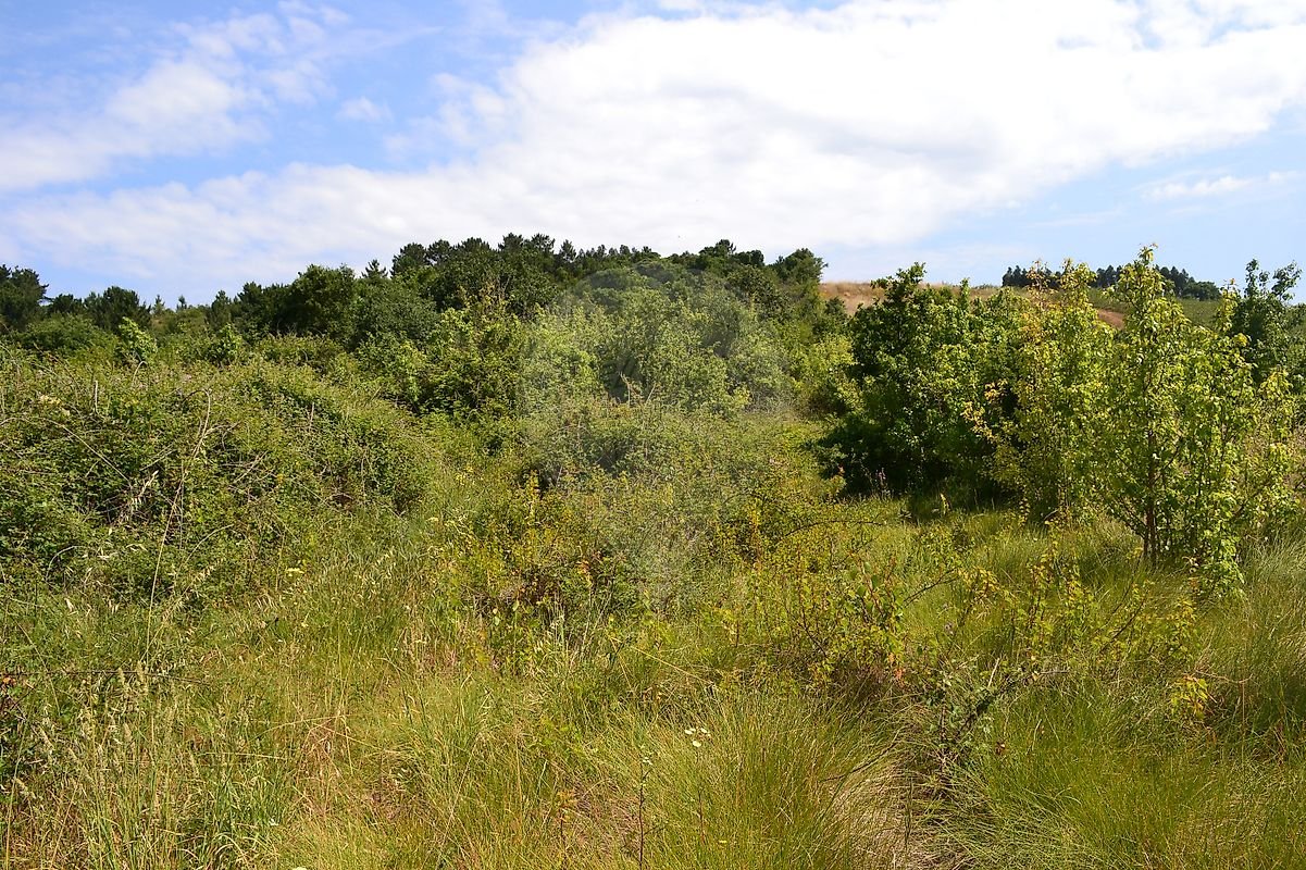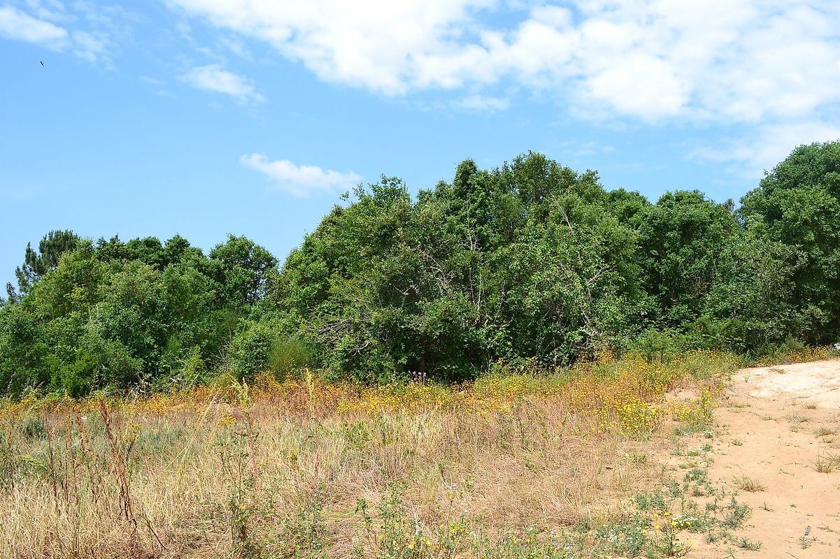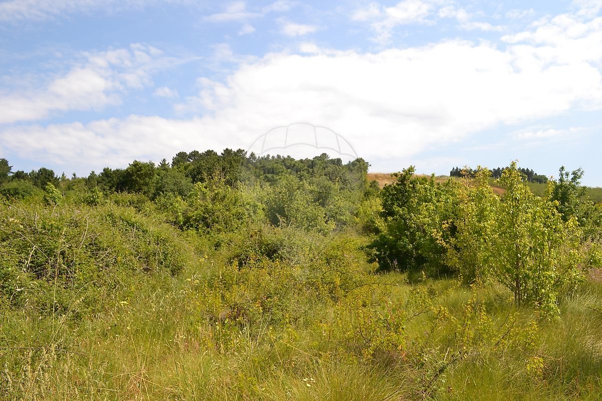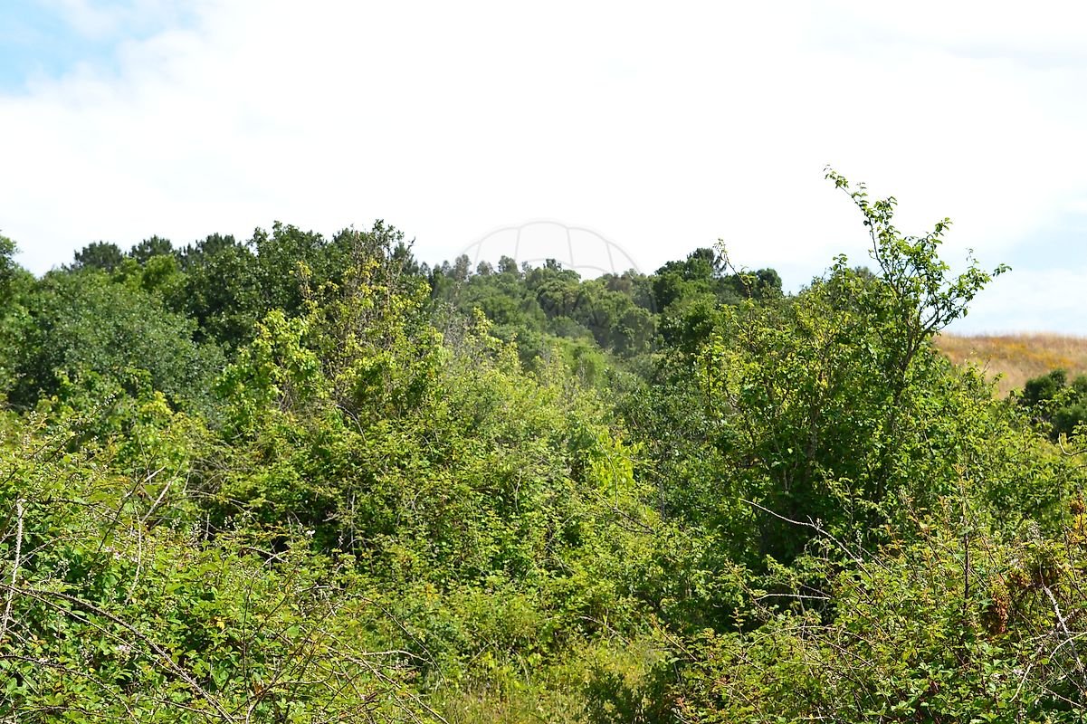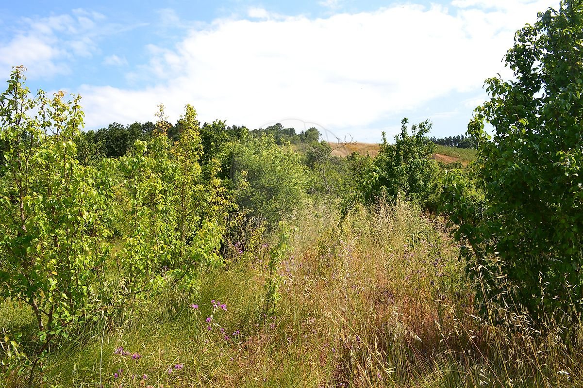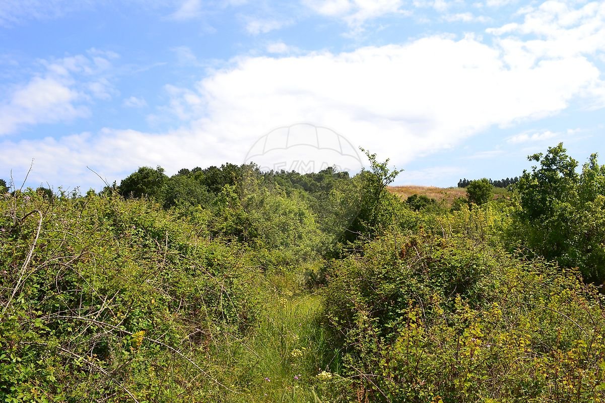 Cerca de metade do terreno em ligeiro declive, com várias árvores de fruto, a outra metade em declive mais acentuado com zona de mato e árvores de médio/grande porte.