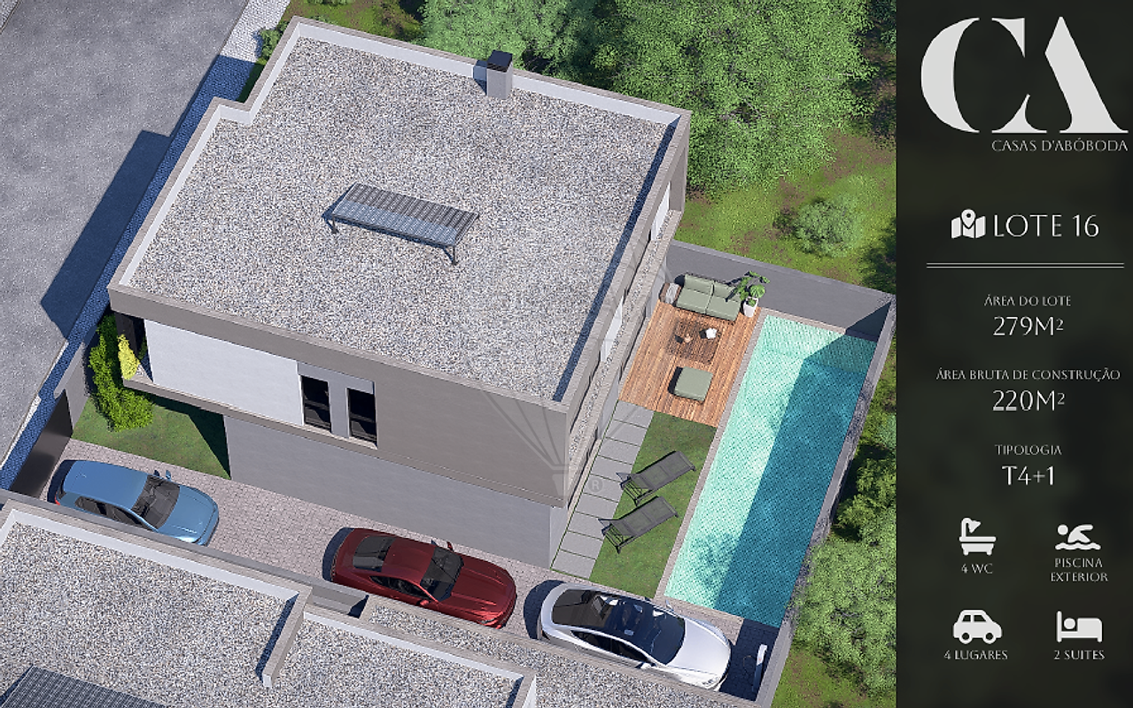 Se vende terreno de 279 m² con proyecto para una vivienda contemporánea T4+1, distribuida en 2 plantas, con jardín y piscina privada.